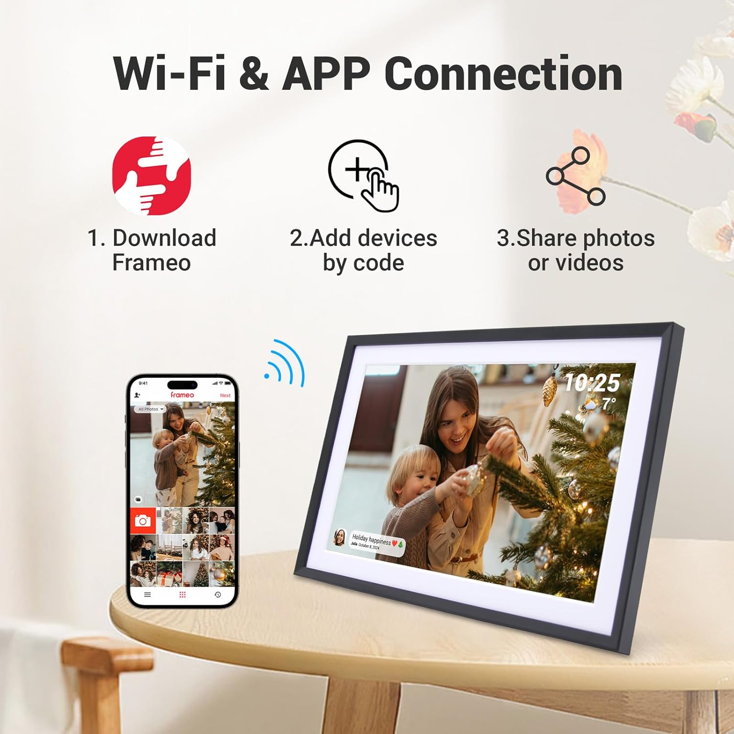 You can send photos and short videos instantly through a companion mobile app (such as Frameo) using Wi-Fi. It takes just a few taps to share moments with your loved ones.